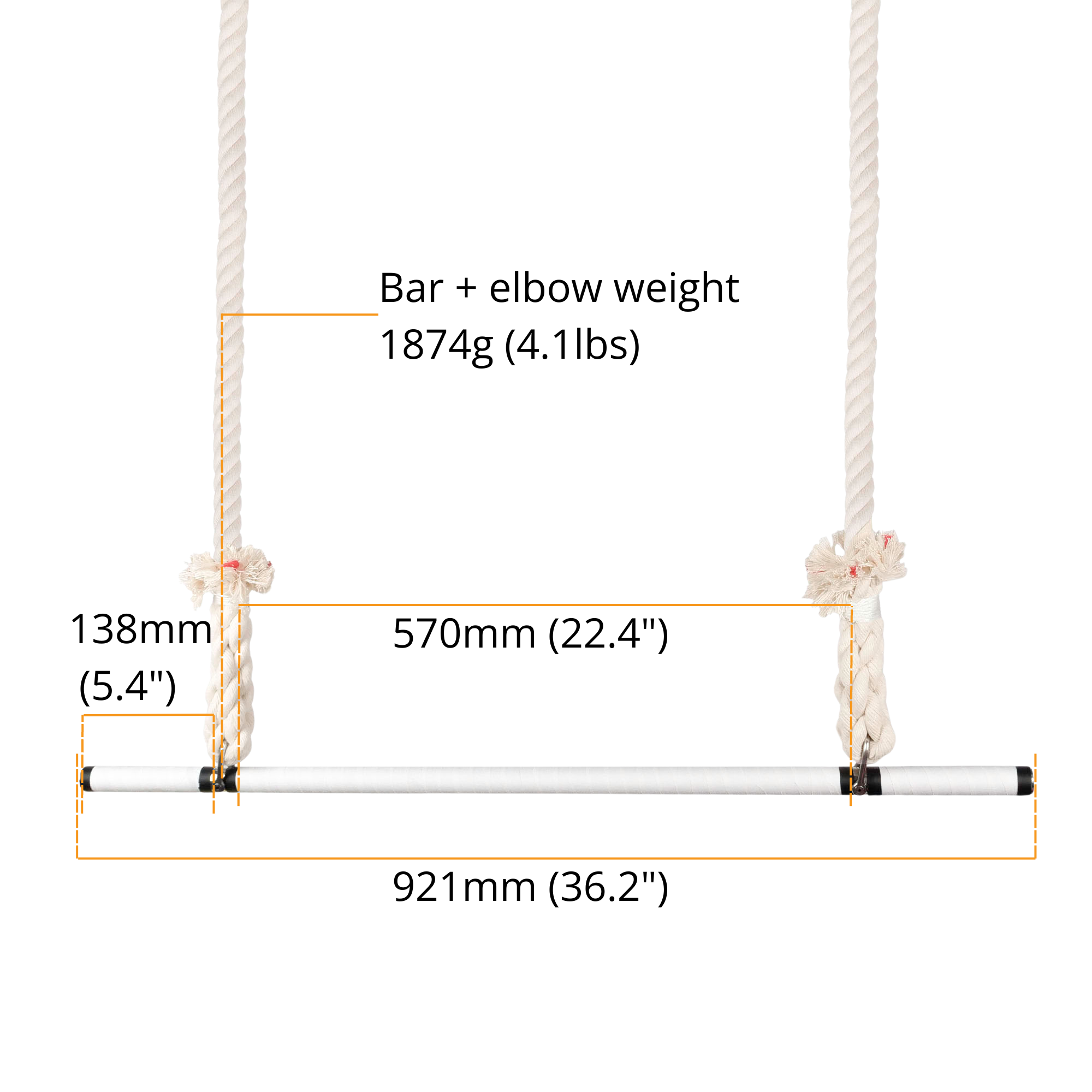 The trapeze's bar is 92cm long from end to end, providing ample space for various aerial poses and tricks. The distance from shackle to shackle is 62cm, making it perfect for doubles work.