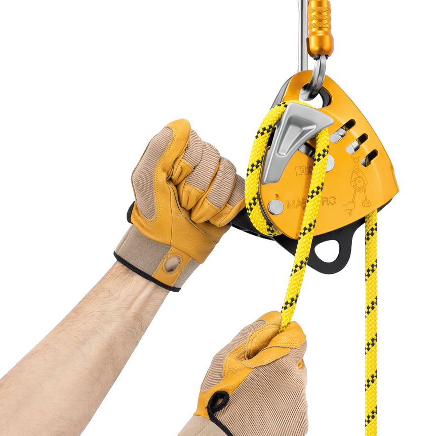 A descender with integrated progress-capture pulley for loads up to 250 kg, compatible with 10.5 to 11.5 mm ropes.
